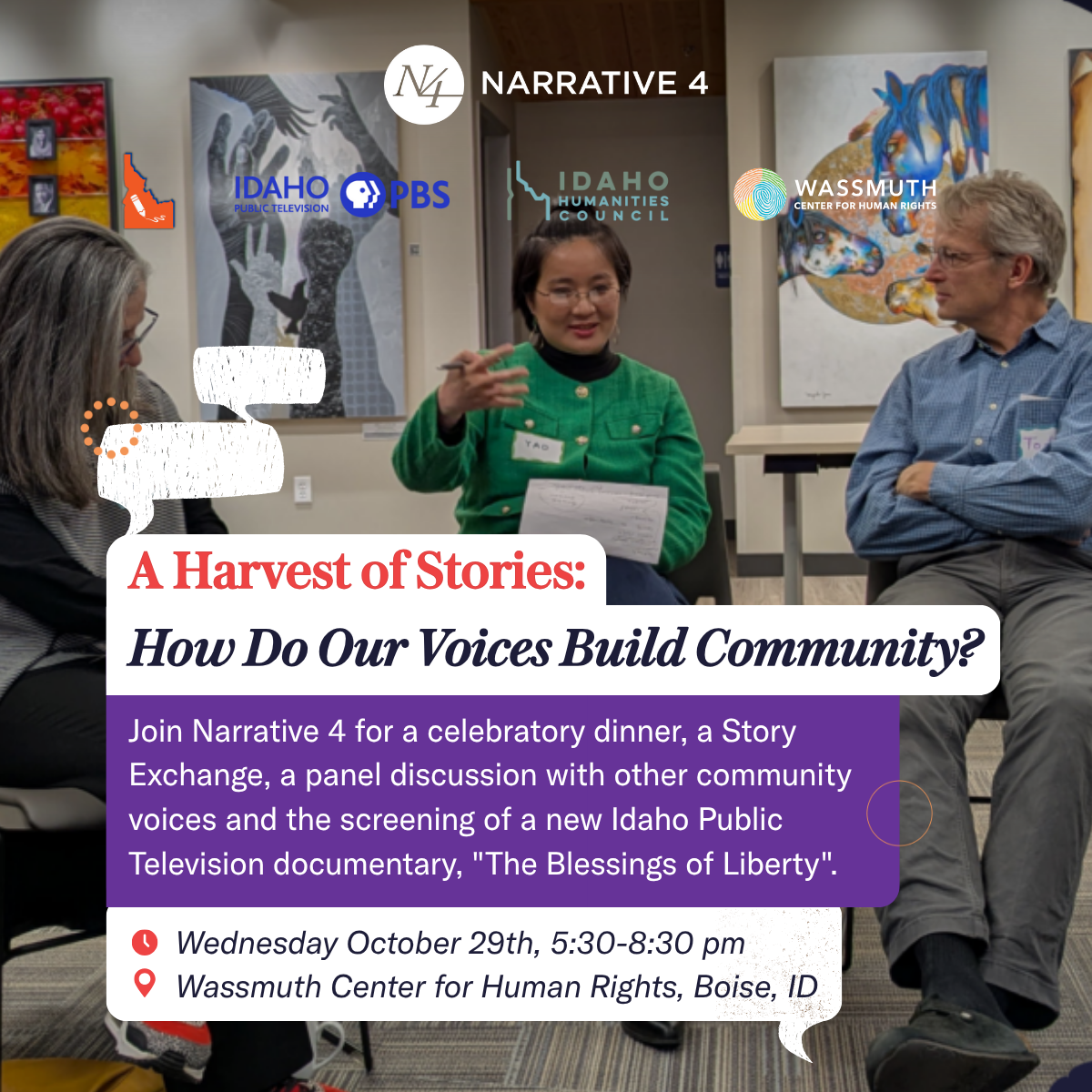 Join Narrative 4 and other community voices for dinner, a mini story exchange, conversation and a screening of the new Idaho Public Television documentary “The Blessings of Liberty” Celebrating the American spirit of citizenship and volunteerism, which celebrates and highlights the ways individuals and organizations are building connections in Idaho. Idaho Public Television’s Executive Producer Bill Manny will introduce the film. Other guests from the film, the filmmaking, and our local nonprofits will add their voices to our conversation on building community through story.